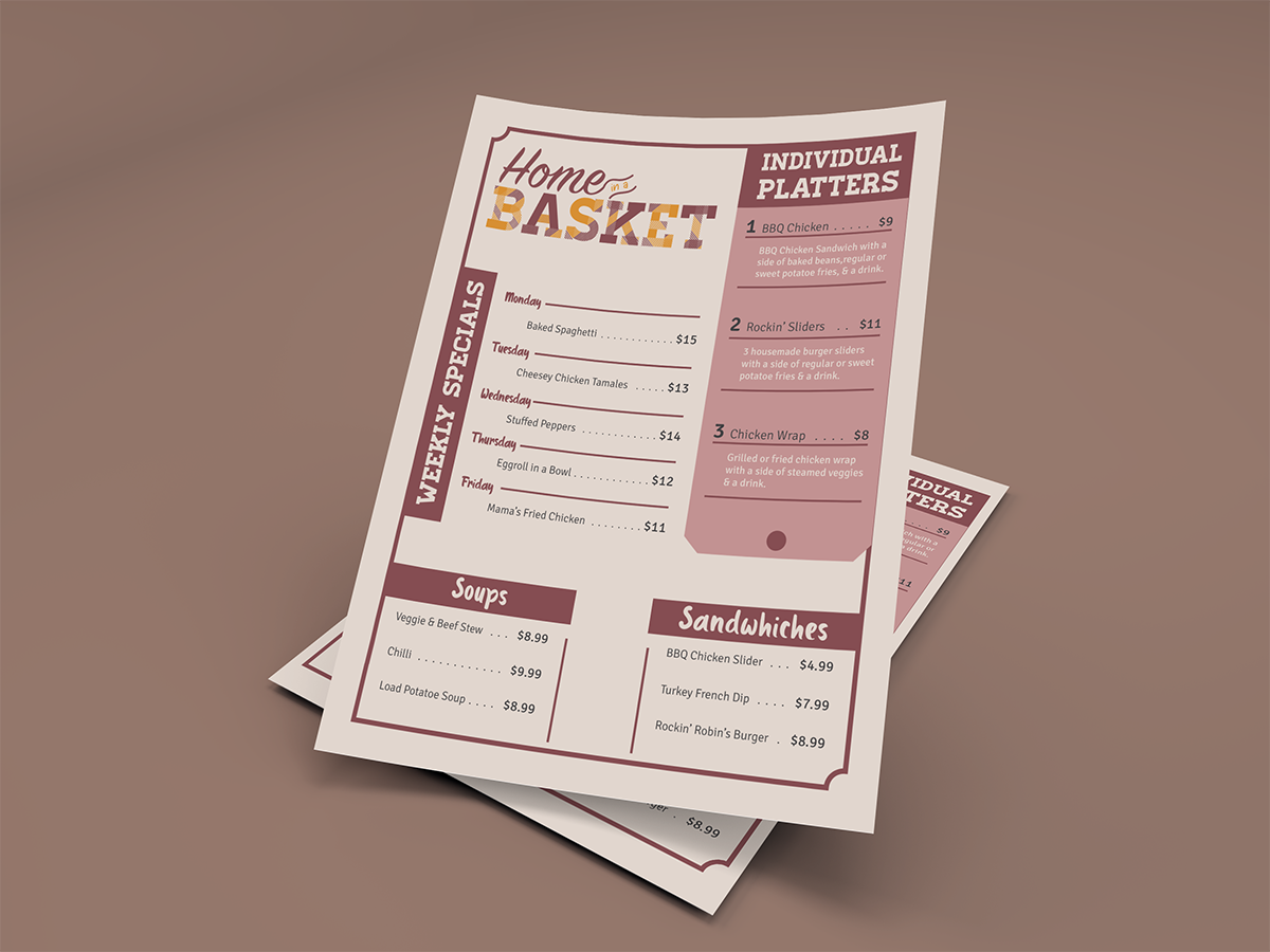 Home in a Basket is a restaurant business system created for a fictional food service that focuses on delivering southern home cooked meals. The overall goal of the business system was to create a southern kitchen aesthetic that represented simplicity, hospitality, and comfort. This was achieved by using warm and welcoming colors and typography, as well as a welcoming typographic logo.
